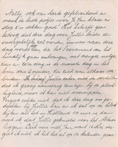 Vergeet echter niet, dat ik deze dag in gedachten bij Jullie ben en ik zal op de klok kijken als het in Holland 10 uur is, dan weet ik, dat Jullie geknield voor het Altaar liggen. Lach nou niet, Jan, want 12 Mei vergeet ik niet, ik het het al op de kalender genoteerd! Ik weer zeker, dat 12 Mei een zeer prettige dag zal worden, daar staan Jullie allen borg voor. Ik heb dat wel geconstateerd tijdens m’n verlof in het Haagje,dat Jullie wel weten, hoe er gefeest moet worden.