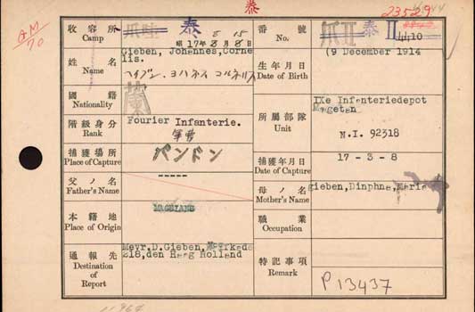 Doordat Joop Gieben voor vijf jaar getekend had, werd hij automatisch de Tweede Wereldoorlog ingetrokken. Hij zat inmiddels als fourier bij de KNIL en werd door de Japanners gevangen genomen. Dat waren geen lieve jongetjes. De Jappen brachten hem als gevangene in 1943 naar Bangkok waar hij aan de Birma spoorlijn. moest werken. Pas twee jaar later, op 30 augustus 1945 werd hij overdragen aan de geallieerden.